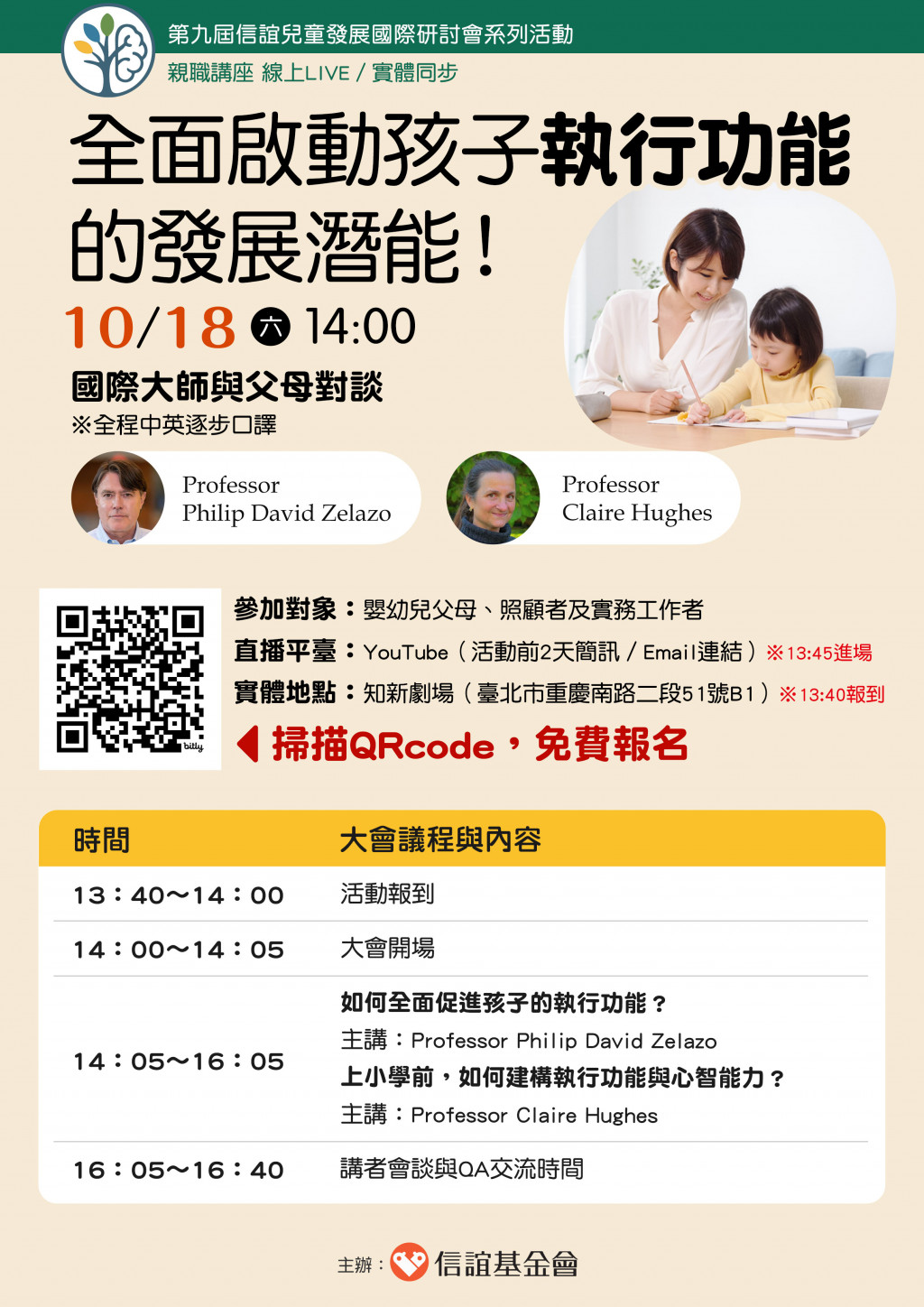 信誼基金會於10/18(六)舉辦第九屆兒童發展國際研討會親職講座【國際大師與父母對談:全面啟動孩子執行功能的發展潛能!】敬告家長、老師,免費報名參加。
