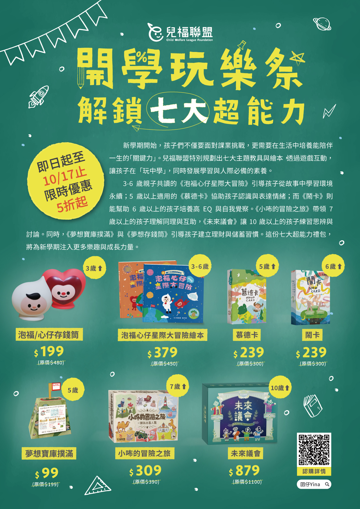 財團法人中華民國兒童福利聯盟基金會推出「開學玩樂祭·解鎖七大超能力」成長禮包,懇請惠予協助宣傳並鼓勵師生踴躍參與。