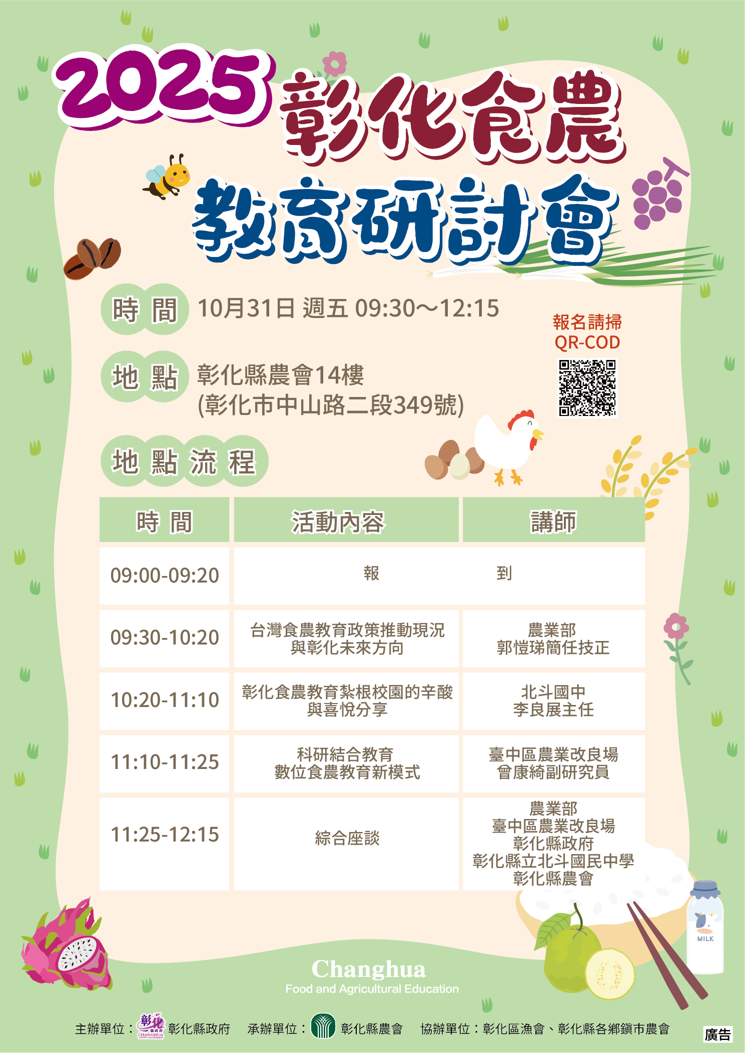 本府訂於10月31日(星期五)上午9時0分假彰化縣農會14樓會議室辦理「2025彰化食農教育研討會」,請貴校鼓勵推動食農教育所屬教師與會,並請惠予公(差)假登記