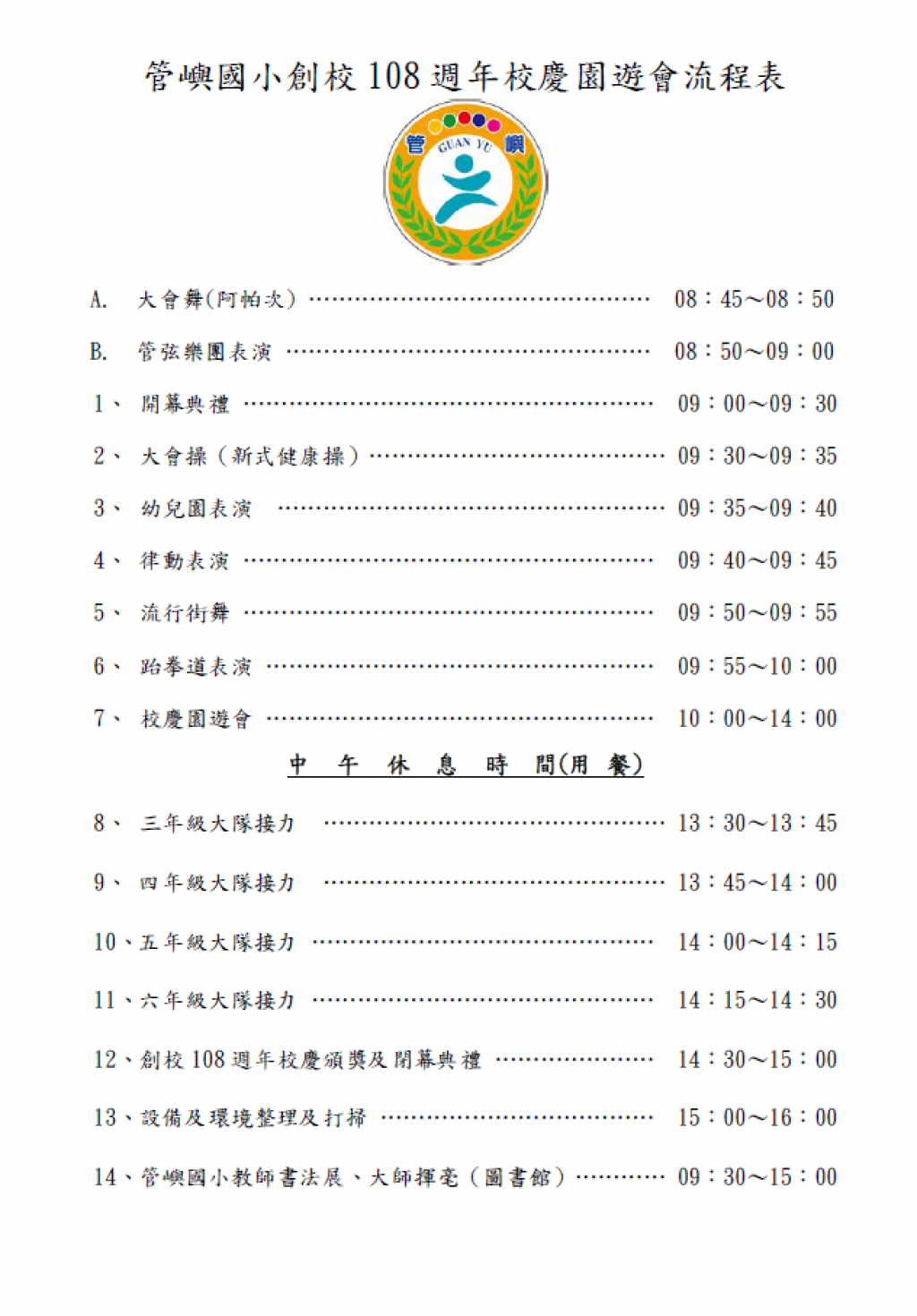 本校訂於114年11月15日(六)舉辦創校108週年校慶園遊會,歡迎各屆社區民眾、家長,到校共襄盛舉,一起來熱鬧。