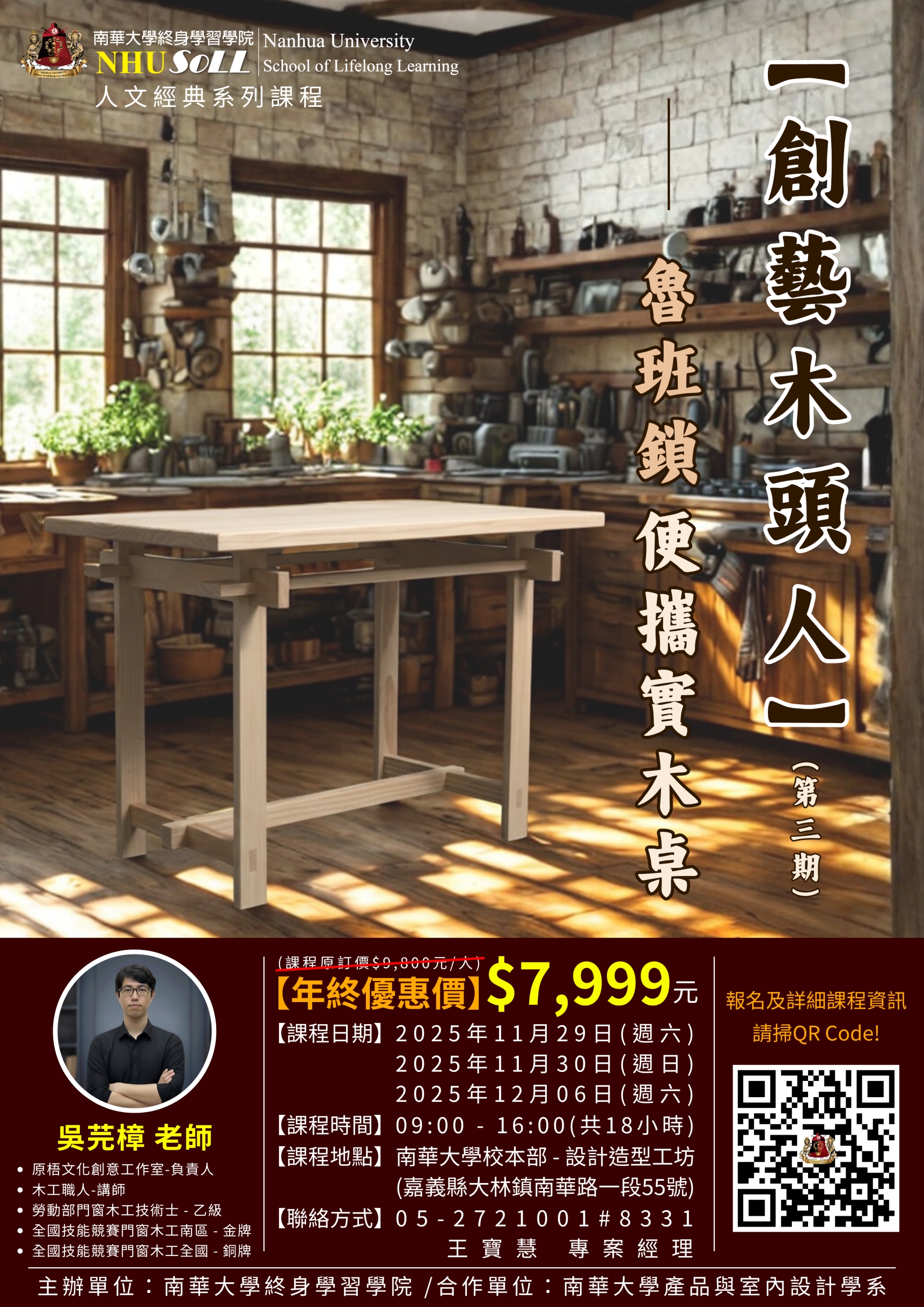 南華大學114年11-12月份開辦之【創藝木頭人】(第三期):魯班鎖便擕實木桌課程資訊,敬請惠予公告及鼓勵同仁踴躍報名參加