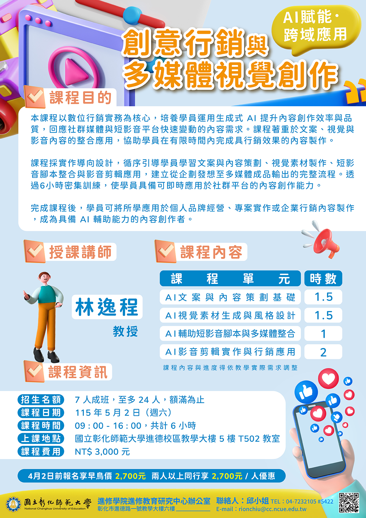 課程特色:本課程採實作導向,透過 AI 文案策劃、視覺生成、短影音腳本編排及自動化剪輯四階段,在 6 小時內強化學員的數位行銷實務能力,成為能即時產出社群內容的全能創作者。 |