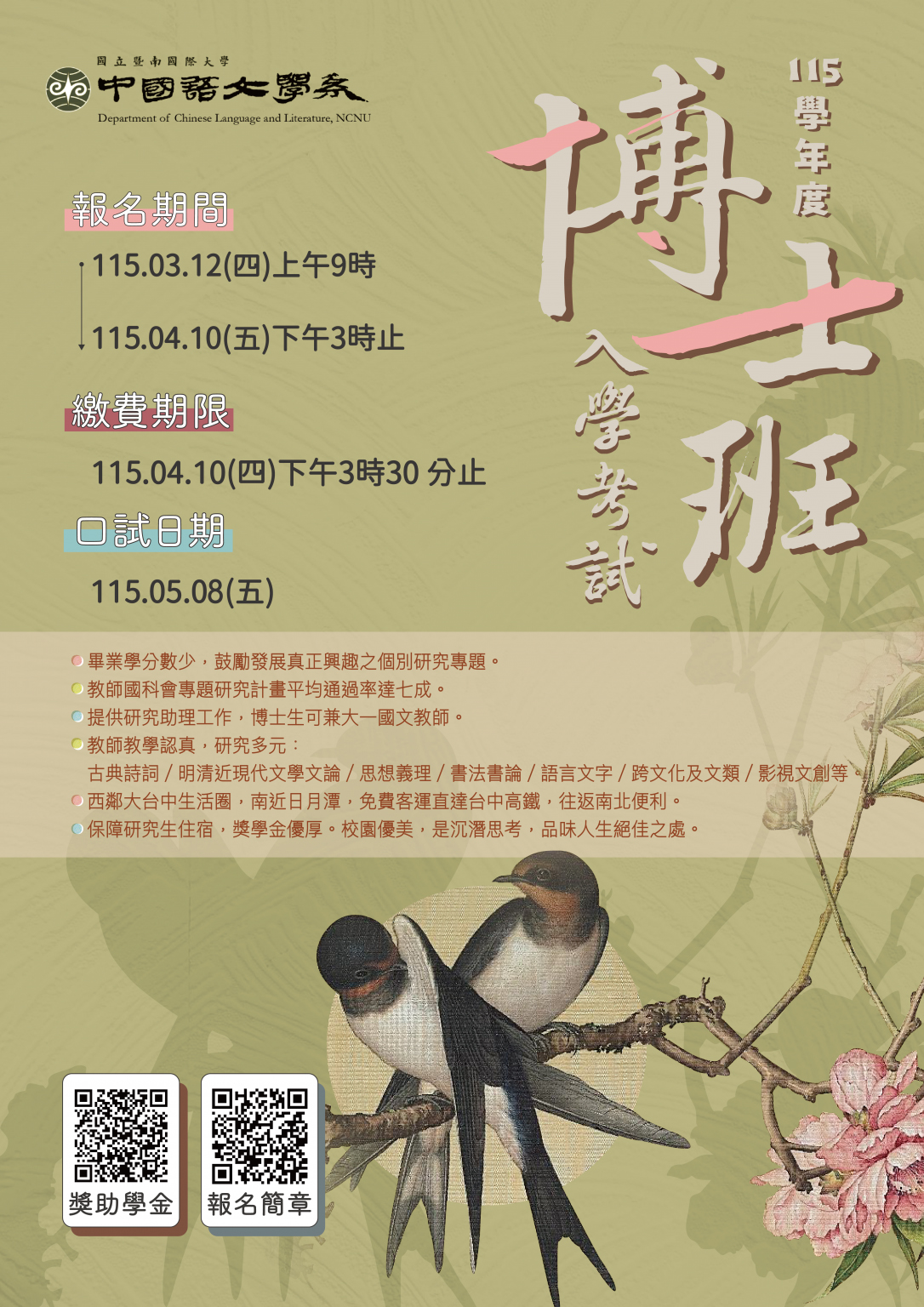 國立暨南國際大學中國語文學系115學年度博士班入學考試