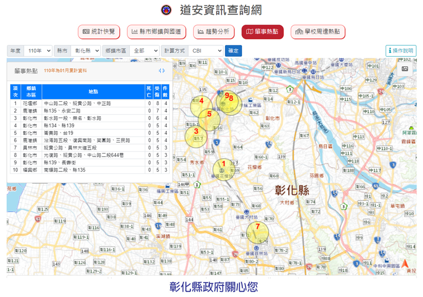 | 三、 | 宣導圖為「110年1月交通事故死傷情形」、「110年1月交通事故統計表」及「彰化縣110年1月份事故與違規熱點」。 |